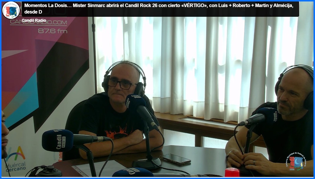 Video: ÂĄÂĄMomentazo La Dosis y anuncio oficial de la banda anfitriona del prĂłximo CANDIL ROCK !!âŠLuis + Roberto + MISTER SINMARC, junto a MartĂn La dosis y AlmĂ©cija DĂas de Radio, presentando el nuevo sencillo «VĂRTIGO» y repasando su historia y trayectoria, desde Candil Radio.