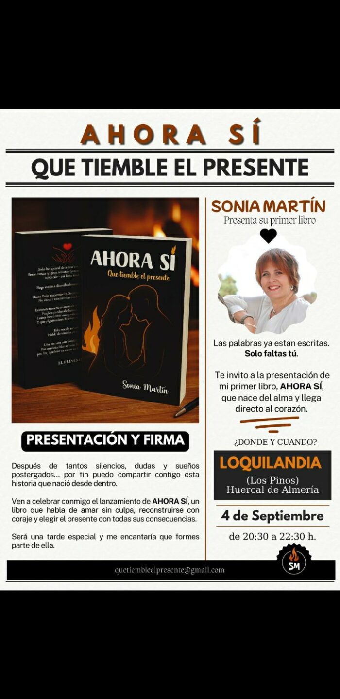SONIA MARTÍN , nuestra amiga y vecina de Huércal nos invita a la presentación de su primer Libro . ¡¡ No falteis !! . Compartir esta publicación Share on FacebookShare on Facebook Share on XShare on X Share on WhatsAppShare on WhatsApp