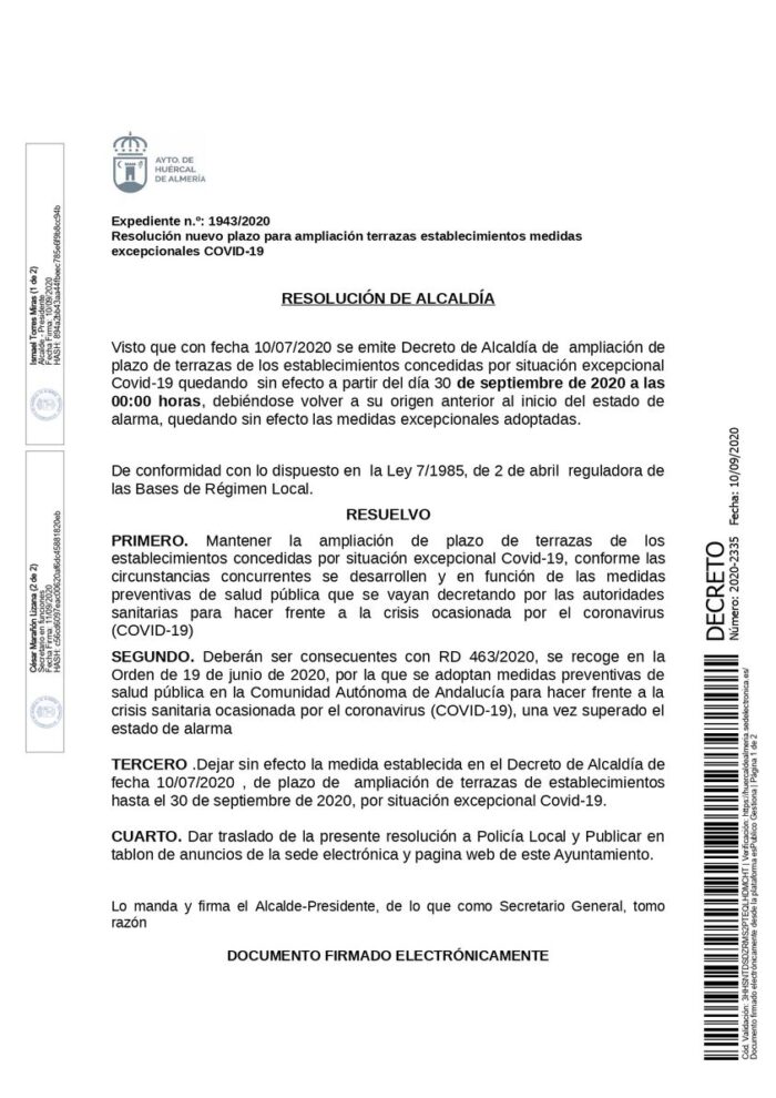 El plazo de terrazas de los establecimientos concedido por la situación excepcional de la COVID-19, que finalizaba el próximo 30 de septiembre, queda ampliado por resolución de Alcaldía conforme las circunstancias concurrentes se desarrollen y en función de las medidas preventivas de salud pública que se vayan decretando por las autoridades sanitarias.