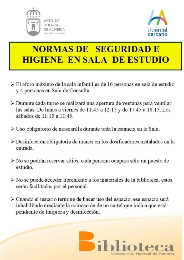 La Biblioteca Huércal de Almería tiene nuevo horario desde este día 13 de octubre. Consúltalo aquí junto con las normas de seguridad e higiene a cumplir obligatoriamente en la sala de estudio.