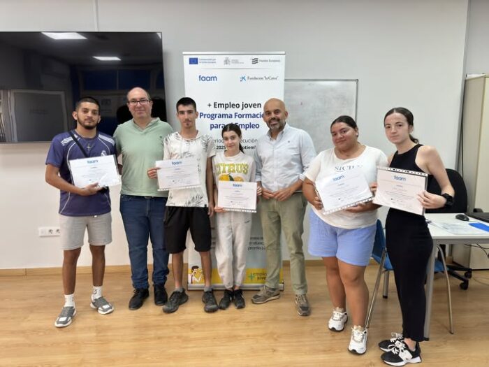 El aula de formación de FAAM ha acogido esta mañana el acto de entrega de diplomas a los alumnos del curso “Limpieza de superficies y mobiliario en edificios y locales» desarrollado por FAAM en el marco del proyecto +Empleo Jóven financiado por Fundación La Caixa y el Fondo Social Europeo (FSE+).