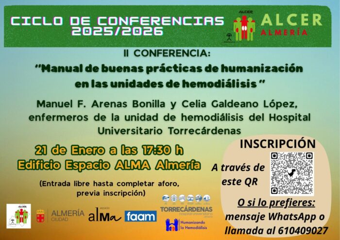 Compartimos con todos vosotros esta información que nos llega desde Alcer Almería y que tendrá lugar el próximo día 21 en la que los enfermeros Manuel Arenas y Celia Galdeano serán los encargados de exponer las buenas prácticas de humanización en las unidades de hemodiálisis.