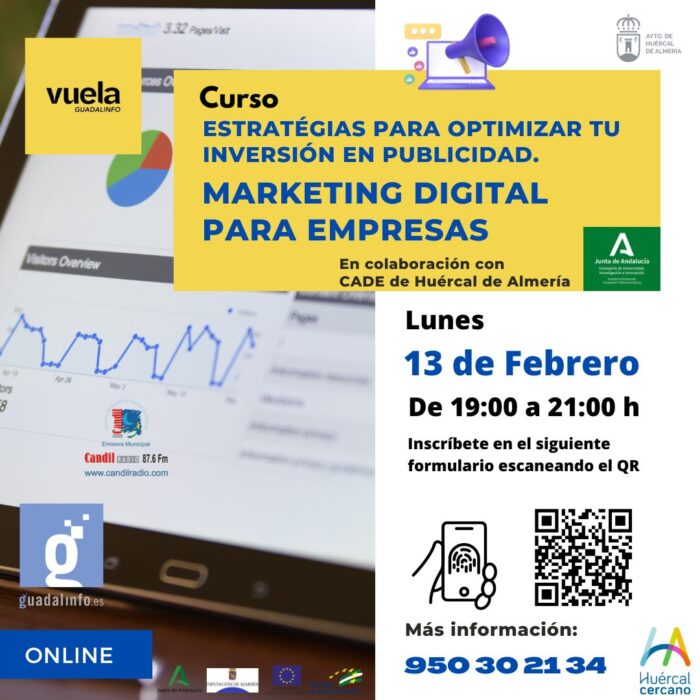 El curso ESTRATEGÍAS PARA OPTIMIZAR TU INVERESIÓN EN PUBLICIDAD. MARKETING DIGITAL PARA EMPRESAS está dentro de un ciclo de acciones formativas encaminado a las PYMES Y Autónomos del municipio que se desarrolla en colaboración con el CADE de Huércal de Almería que está formado por seis cursos formativos en formato online de una jornada de duración cada curso. Se realizarán a través de Google Meet.