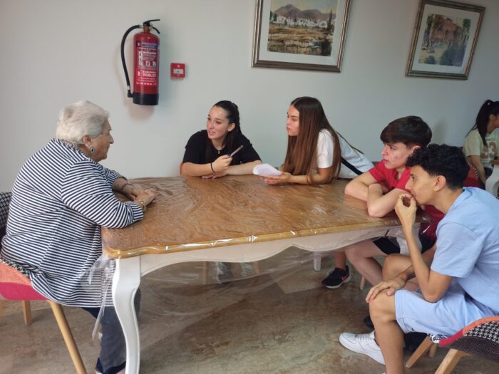 Las alumnas y alumnos de 4º de ESO de Música les hacen una pequeña entrevista sobre tradiciones, bailes, canciones y refranes a los ancianos del Centro de Estancias Diurnas «Carmen» de Alhama de Almería.